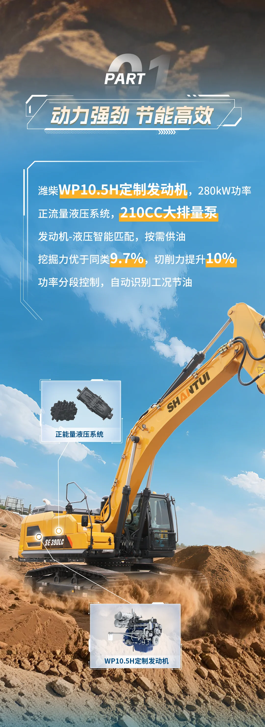 山推SE390LC-9W液壓挖掘機,系山推挖掘機產(chǎn)品新一代大挖產(chǎn)品,動力強勁,擁有同級別領(lǐng)先的超大挖掘力,結(jié)構(gòu)可靠,回轉(zhuǎn)扭矩大,能為客戶帶來更好的使用體驗。選用德國技術(shù)及工藝控制的液壓元件,配置新一代林德電控系統(tǒng),動作協(xié)調(diào)性好,性能穩(wěn)定。全新設(shè)計的大型駕駛室,駕駛員駕乘空間更加寬敞,舒適性好,配合外側(cè)大曲率后視鏡,工作視野開闊,作業(yè)安全性高。強化型工作裝置● 全面優(yōu)化結(jié)構(gòu)件設(shè)計,關(guān)鍵受力位置強化處理,無懼惡劣工況;● 鏟斗底板、側(cè)板及加強板均采用高強耐磨材料,提高鏟斗耐用性;● 多規(guī)格動臂、斗桿、鏟斗輕松組合,適應(yīng)各種工況。 高端的系統(tǒng)配置● 濰柴WP10H挖掘機定制款高適應(yīng)性渦輪增壓發(fā)動機;● 世界一流品牌的液壓配置,正流量系統(tǒng),操作靈活,工作壓力高,壓力損失小。 寬敞舒適的操作環(huán)境● 全注塑內(nèi)飾,根據(jù)人機工程進行內(nèi)飾色彩有效搭配,不易引起操作者的視覺疲勞;● 空間大,視野開闊,操縱裝置布置合理,操作方便舒適;● 大功率空調(diào),空氣懸浮式座椅,駕乘舒適。 四輪一帶● 30年四輪一帶研發(fā)制造經(jīng)驗,世界領(lǐng)先技術(shù);● 世界頂尖的鍛造熱處理工藝,質(zhì)量穩(wěn)定可靠。智能電控,最優(yōu)功率控制● 智能控制系統(tǒng)實現(xiàn)動力系統(tǒng)和液壓系統(tǒng)的最佳匹配,提高了作業(yè)效率,降低了燃油消耗;● 人機友好的新一代智能電控系統(tǒng),讓你的機器工作狀態(tài)盡在掌握;● 通過云平臺可以隨時查看車輛的位置、運行軌跡、工作狀態(tài)等相關(guān)信息。維護快捷方便● 向后開起的發(fā)動機罩,開起輕便,開起角度大,方便保養(yǎng)維修;● 機油濾芯遠置于右側(cè)門處,保養(yǎng)維護方便;● 高精度燃油濾芯,集中布置于左側(cè)門處,保養(yǎng)維護方便;● 冷卻液加注、空氣濾芯更換觸手可及;● 并列式散熱器,有效的避免過熱現(xiàn)象,方便清理。整機可選配置● 燃油加注泵● 駕駛室警燈● 駕駛室頂燈● 急停開關(guān)● 機體后攝像頭● 駕駛室頂防護網(wǎng)● 駕駛室前上防護網(wǎng)● 駕駛室前下防護網(wǎng)● 橡膠履帶可選附屬裝置● 破碎錘、松土器、木料抓斗、石料抓斗、快換裝置、液壓夯、破碎錘管路。