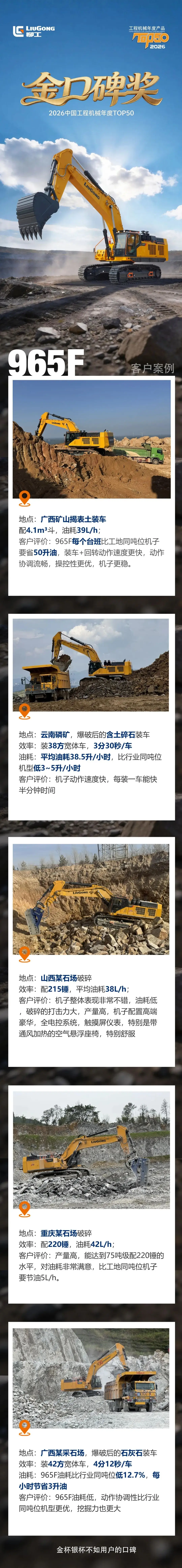 柳工965EHDG4:近年來在礦山行業客戶中收獲了大量好評,特別是在省油、高效等方面表現突出,被譽為“省油神話”和“礦山黃金搭檔”。